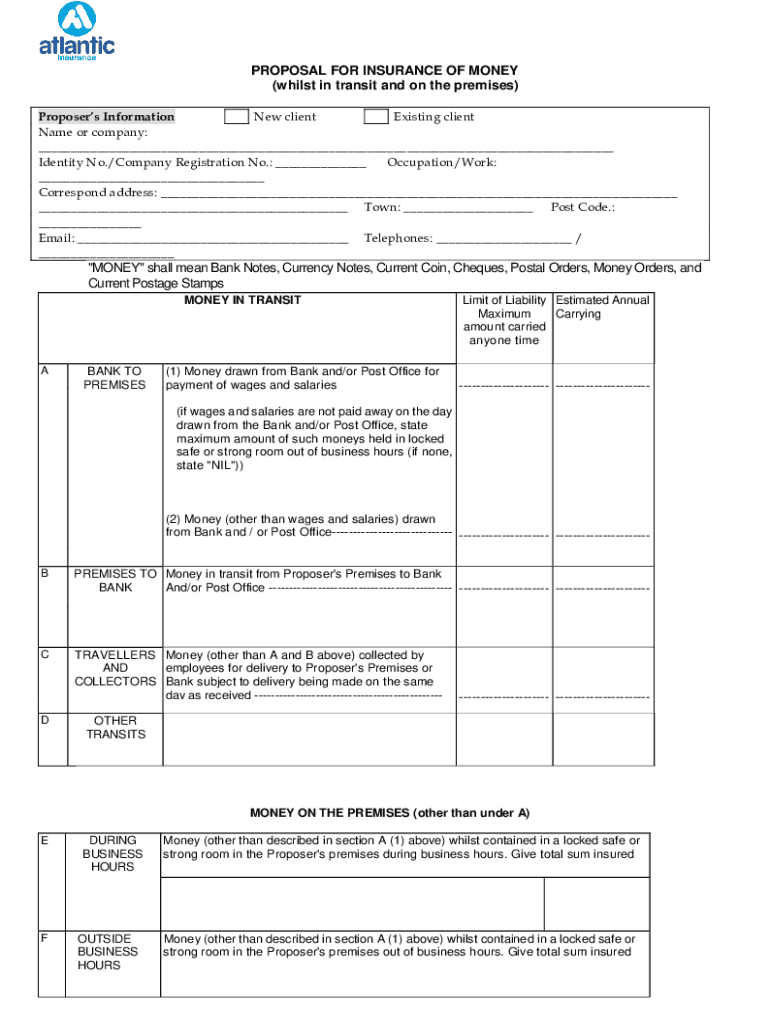 PROPOSAL FOR INSURANCE OF MONEY (whilst in transit and on the premises) Proposers Information New client Existing client Name or company: Identity No./Company Registration No.: Occupation/Work: Correspond