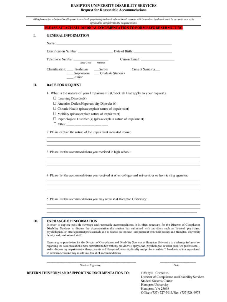 HAMPTON UNIVERSITY DISABILITY SERVICES Request for Reasonable Accommodations All information obtained in diagnostic medical, psychological and educational reports will be maintained and used in accordance