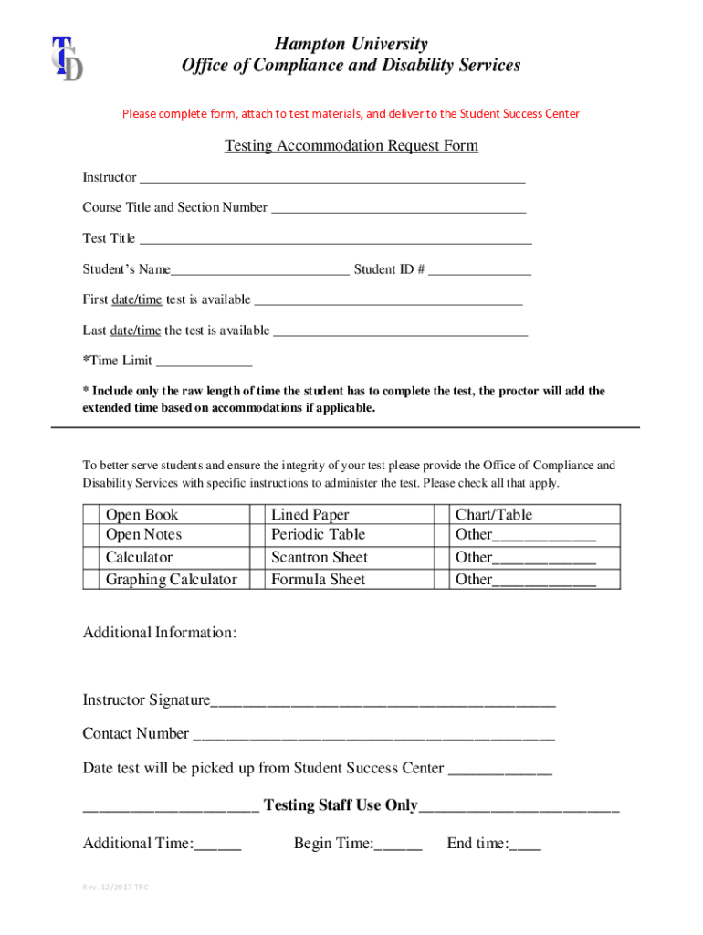 Hampton University Office of Compliance and Disability Services Please complete form, attach to test materials, and deliver to the Student Success Interesting Accommodation Request Form Instructor