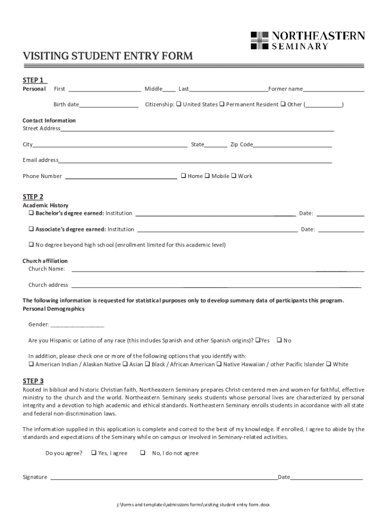 VISITING STUDENT ENTRY FORM STEP 1 PersonalFirstMiddleBirth dateCitizenship:Platformer reunited StatesPermanent ResidentOther ()Contact Information Street Address CityStateZip Voicemail address Phone