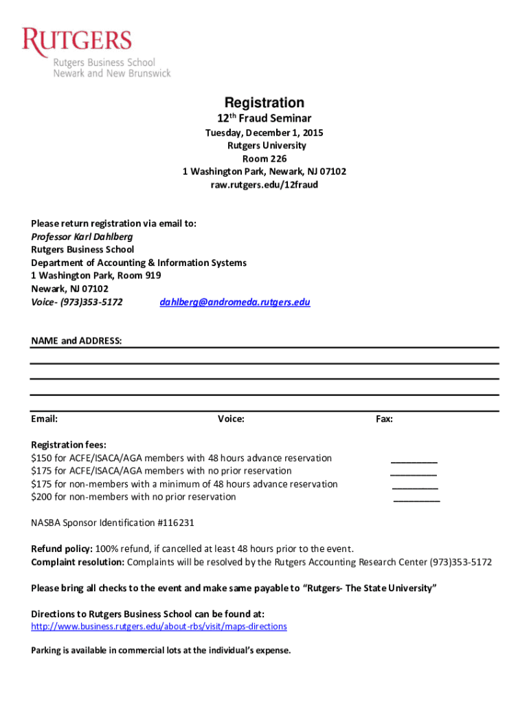 Registration 12th Fraud Seminar Tuesday, December 1, 2015, Rutgers University Room 226 1 Washington Park, Newark, NJ 07102 raw.rutgers.edu/12fraudPlease return registration via email to: Professor