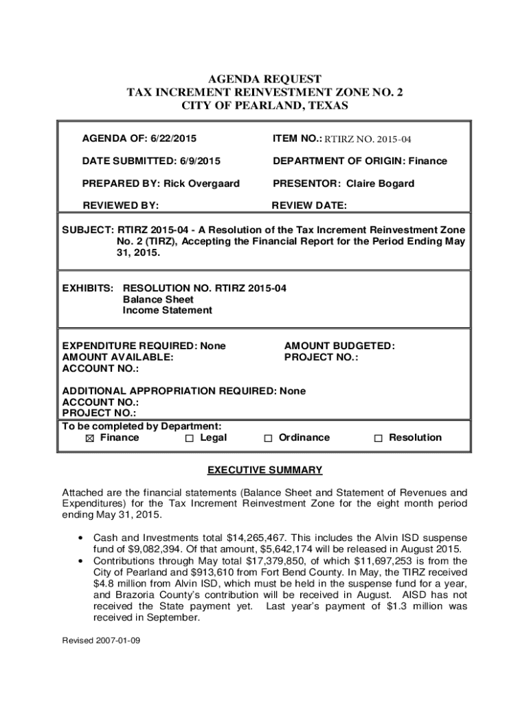 AGENDA REQUEST TAX INCREMENT REINVESTMENT ZONE NO. 2 CITY OF PEARLAND, TEXAS AGENDA OF: 6/22/2015ITEM NO.: RETIRE NO. 201504DATE SUBMITTED: 6/9/2015DEPARTMENT OF ORIGIN: FinancePREPARED BY: Rick OvergaardPRESENTOR: