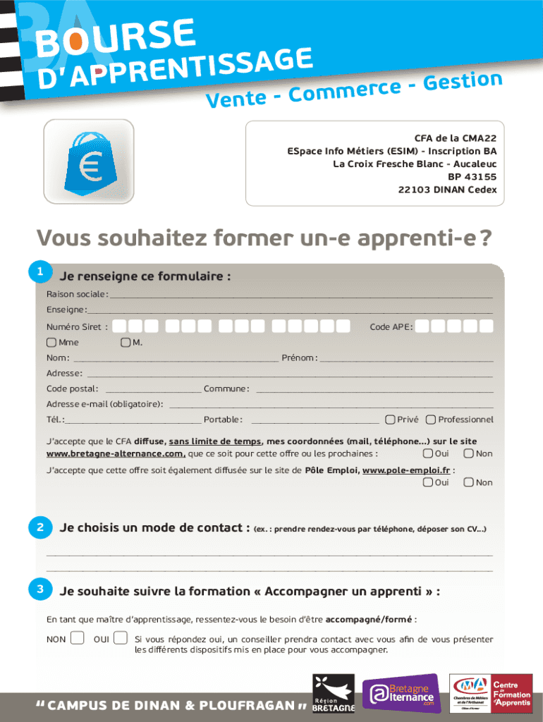 BOURSETISSAGE N E R P P A DN o i t s e G e c rte CommeVenCFA de la CMA22 Space Info Tears (ENIM) Inscription BA La Croix French Blanc Nucleus BP 43155 22103 DINAH Rendezvous souhaitez former one apprentice?