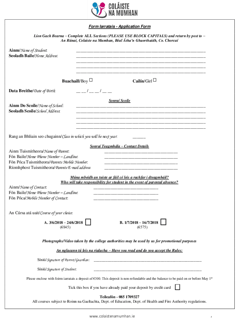 Form Narrates Application Form Lon Each Arena Complete ALL Sections (PLEASE USE BLOCK CAPITALS) and return by post to An RNA, The Holiest Na Human, Worse than Ghaorthaidh, Co. ChorcaAinm/Name of Student: