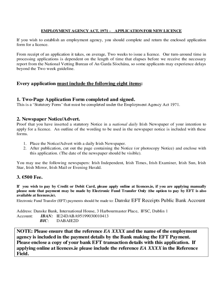 EMPLOYMENT AGENCY ACT, 1971 APPLICATION FOR NEW License you wish to establish an employment agency, you should complete and return the enclosed application form for a license. From receipt of an application