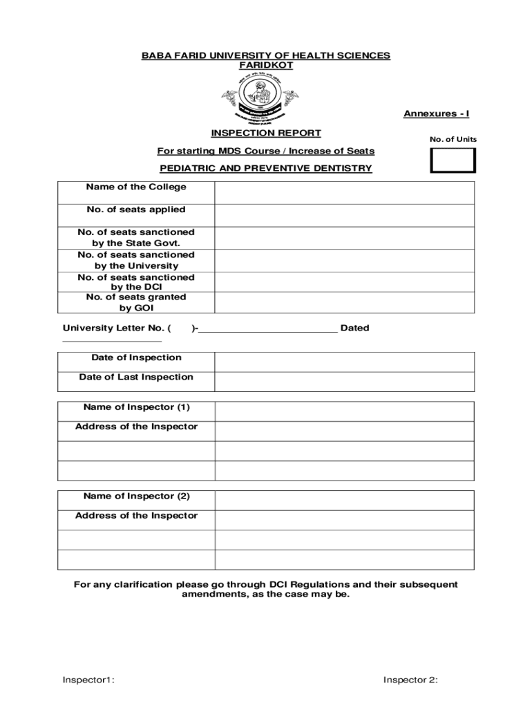 BABA FARID UNIVERSITY OF HEALTH SCIENCES FARIDKOTAnnexures I INSPECTION REPORT No. Of Units starting MDS Course / Increase of Seats PEDIATRIC AND PREVENTIVE DENTISTRY Name of the College No. of seats
