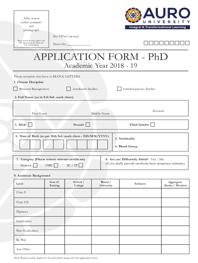 Affix recent color passport size photograph For Office use only Photo should be cross signed with half signature on the form and half on the platform No. APPLICATION FORM PhD Academic Year 2018 19Please