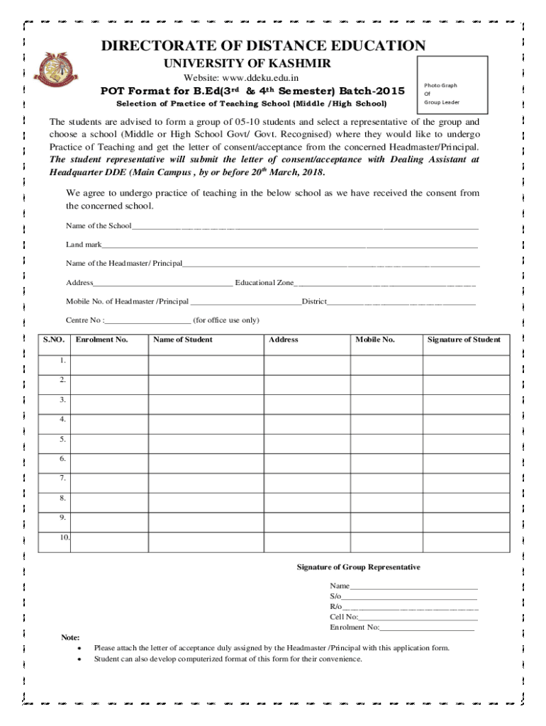DIRECTORATE OF DISTANCE EDUCATION UNIVERSITY OF KASHMIR Website: www.ddeku.edu.inPOT Format for B. Ed(3rd & 4th Semester) Batch2015 Selection of Practice of Teaching School (Middle /High School)Photo
