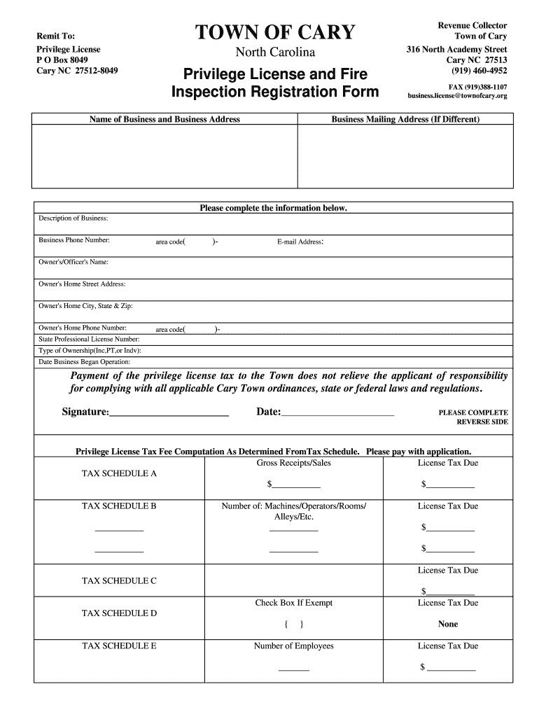 TOWN OF CARY Remit To: Privilege License P O Box 8049 Cary NC 27512-8049 North Carolina Privilege License and Fire Inspection Registration Form Name of Business and Business Address Revenue Collector