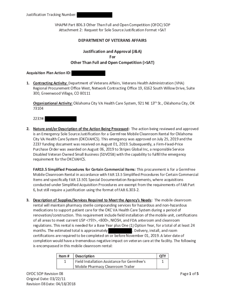 Justification Tracking Number: VH APM Part 806.3 Other Than Full and Open Competition (OFAC) SOP Attachment 2: Request for Sole Source Justification Format DEPARTMENT OF VETERANS AFFAIRS Justification