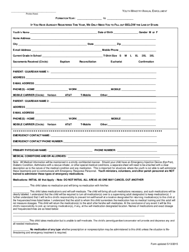 YOUTH MINISTRY ANNUAL ENROLLMENTPARISH REFORMATION YEAR: TO IF YOU HAVE ALREADY REGISTERED THIS YEAR, WE ONLY NEED YOU TO FILL OUT BELOW THE LINE OF STARS Youths Name Date of Birth Gender M or F Home