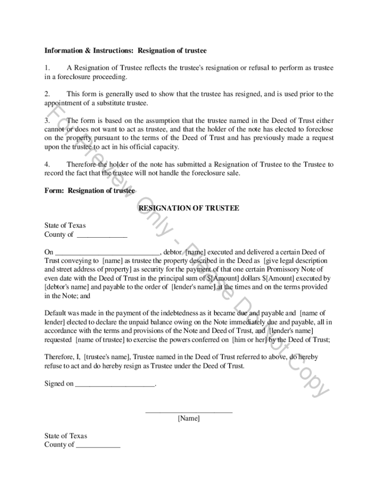 Information & Instructions: Resignation of trustee 1. A Resignation of Trustee reflects the trustee's resignation or refusal to perform as trustee in a foreclosure proceeding. 2. This form is generally