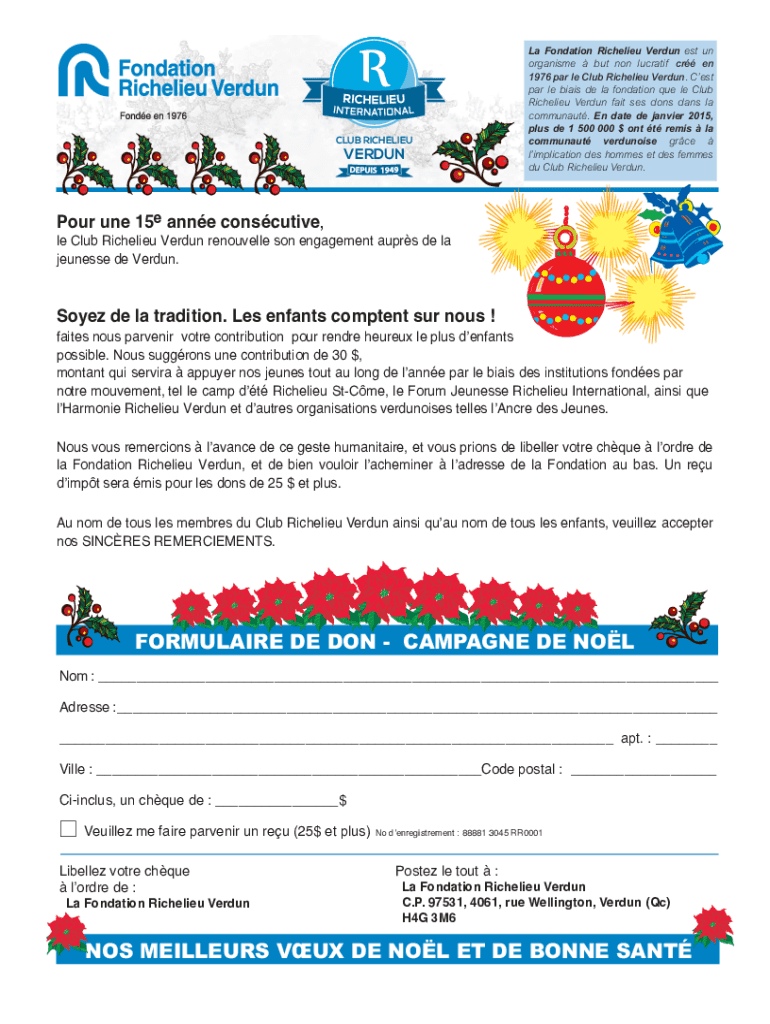 CLUB RICHELIEUVERDUNLa Foundation Richelieu Verdun est UN organism but non-lucrative CR en 1976 par LE Club Richelieu Verdun. CEST par LE bias DE la foundation Que LE Club Richelieu Verdun wait SES