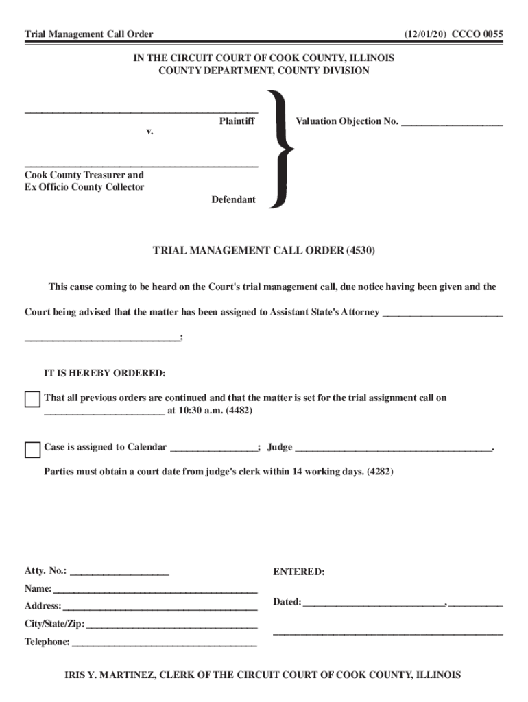 Trial Management Call Order(12/01/20) CCC 0055IN THE CIRCUIT COURT OF COOK COUNTY, ILLINOIS COUNTY DEPARTMENT, COUNTY DIVISION Plaintiff. Cook County Treasurer and Ex Officio County Collector DefendantValuation