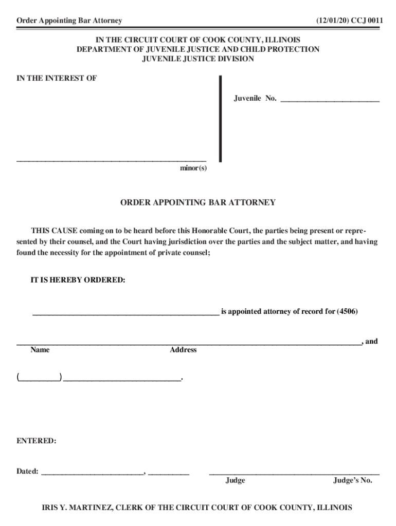 Order Appointing Bar Attorney(12/01/20) CCJ 0011IN THE CIRCUIT COURT OF COOK COUNTY, ILLINOIS DEPARTMENT OF JUVENILE JUSTICE AND CHILD PROTECTION JUVENILE JUSTICE DIVISION IN THE INTEREST OF Juvenile