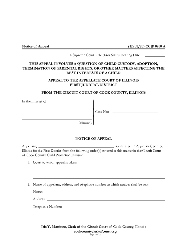 Notice of Appeal(12/01/20) CCP 0800 A ll Supreme Court Rule 306A Status Hearing Date::THIS APPEAL INVOLVES A QUESTION OF CHILD CUSTODY, ADOPTION, TERMINATION OF PARENTAL RIGHTS, OR OTHER MATTERS AFFECTING