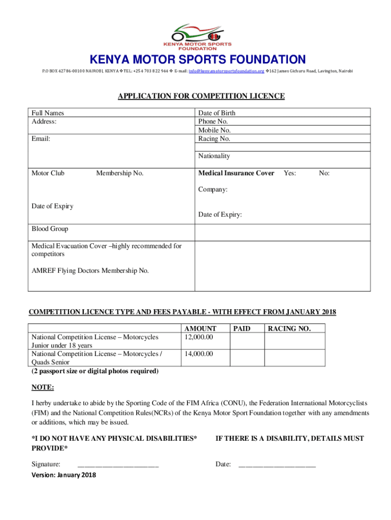 KENYA MOTOR SPORTS FOUNDATION P. O BOX 4278600100 NAIROBI, KENYA TEL: +254 703 822 944 Email: info kenyamotorsportsfoundation.org 162 James Richard Road, Laving ton, NairobiAPPLICATION FOR COMPETITION