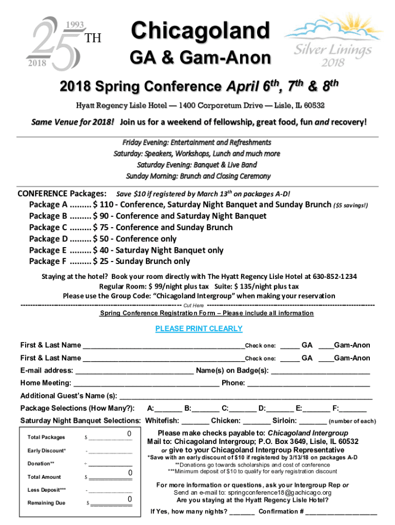 19932018THChicagolandGA & GamAnon2018 Spring Conference April 6th, 7th & 8th Hyatt Regency Lisle Hotel 1400 Corporate Drive Lisle, IL 60532Same Venue for 2018! Join us for a weekend of fellowship,