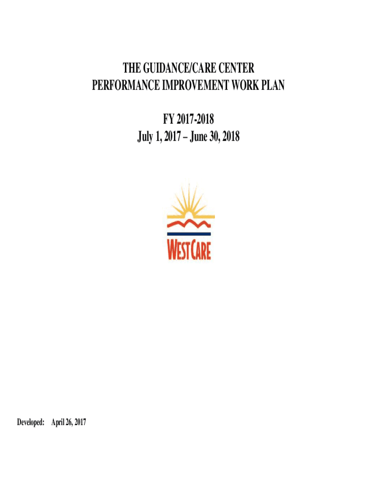 THE GUIDANCE/CARE CENTER PERFORMANCE IMPROVEMENT WORK PLAN FY 20172018 July 1, 2017, June 30, 2018Developed:April 26, 2017Guidance Care Center/Westward FloridaPerformance Improvement Work Plan I.