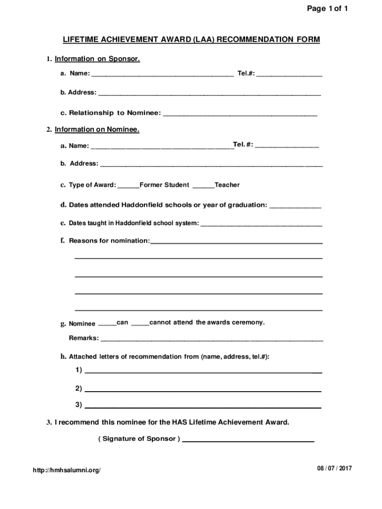 Page 1 of 1LIFETIME ACHIEVEMENT AWARD (LAW) RECOMMENDATION FORM 1. Information on Sponsor. a. Name: Tel.#: b. Address: c. Relationship to Nominee: 2. Information on Nominee.a. Name: Tel. #: b. Address: