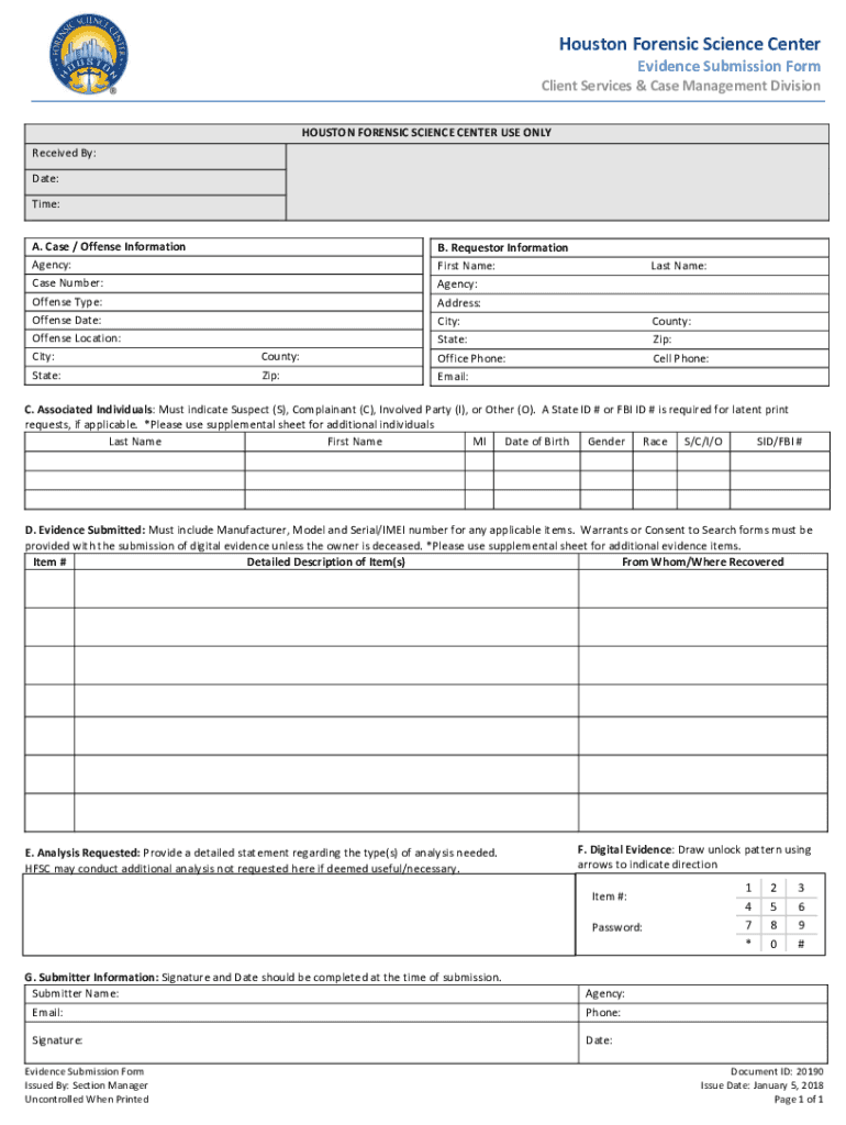 Houston Forensic Science Center Evidence Submission Form Client Services & Case Management Division HOUSTON FORENSIC SCIENCE CENTER USE ONLY Received By: Date: Time: A. Case / Offense Information