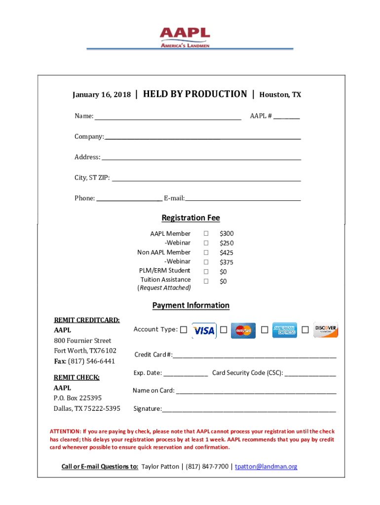January 16, 2018, HELD BY PRODUCTION Name:Houston, AAPL # Company: Address: City, ST ZIP: Phone: Email:Registration Fee AAPL Member Webinar Non AAPL Member Webinar PLM/ERM Student Tuition Assistance