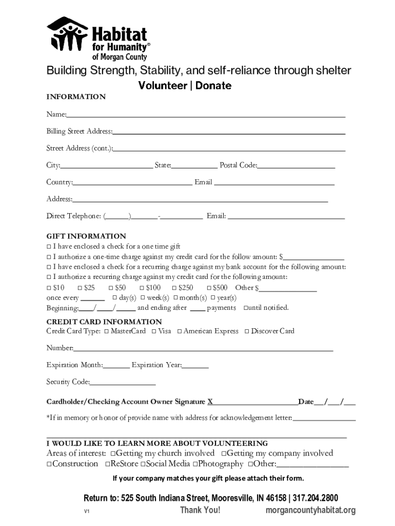 Building Strength, Stability, and self-reliance through shelter INFORMATION Name: Billing Street Address: Street Address (cont.): City:State:Country:Postal Code: Misaddress: Direct Telephone: ()Email:GIFT