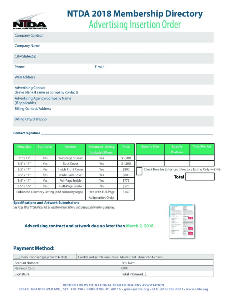 NTD 2018 Membership DirectoryAdvertising Insertion Intercompany Contact Company Name City/State/Zip PhoneEmailWeb Address Advertising Contact (leave blank if same as company contact) Advertising Agency/Company