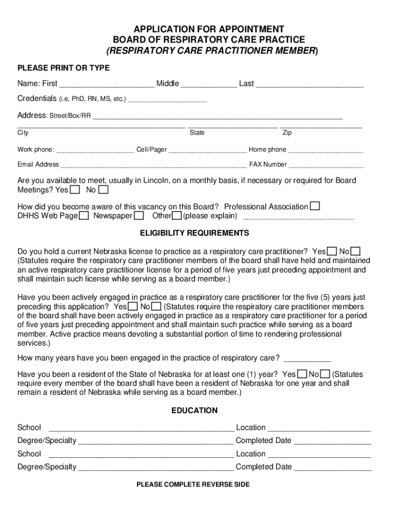 APPLICATION FOR APPOINTMENT BOARD OF RESPIRATORY CARE PRACTICE (RESPIRATORY CARE PRACTITIONER MEMBER) PLEASE PRINT OR TYPE Name: First Middle Last Credentials (i.e, PhD, RN, MS, etc.) Address: Street/Box/RR