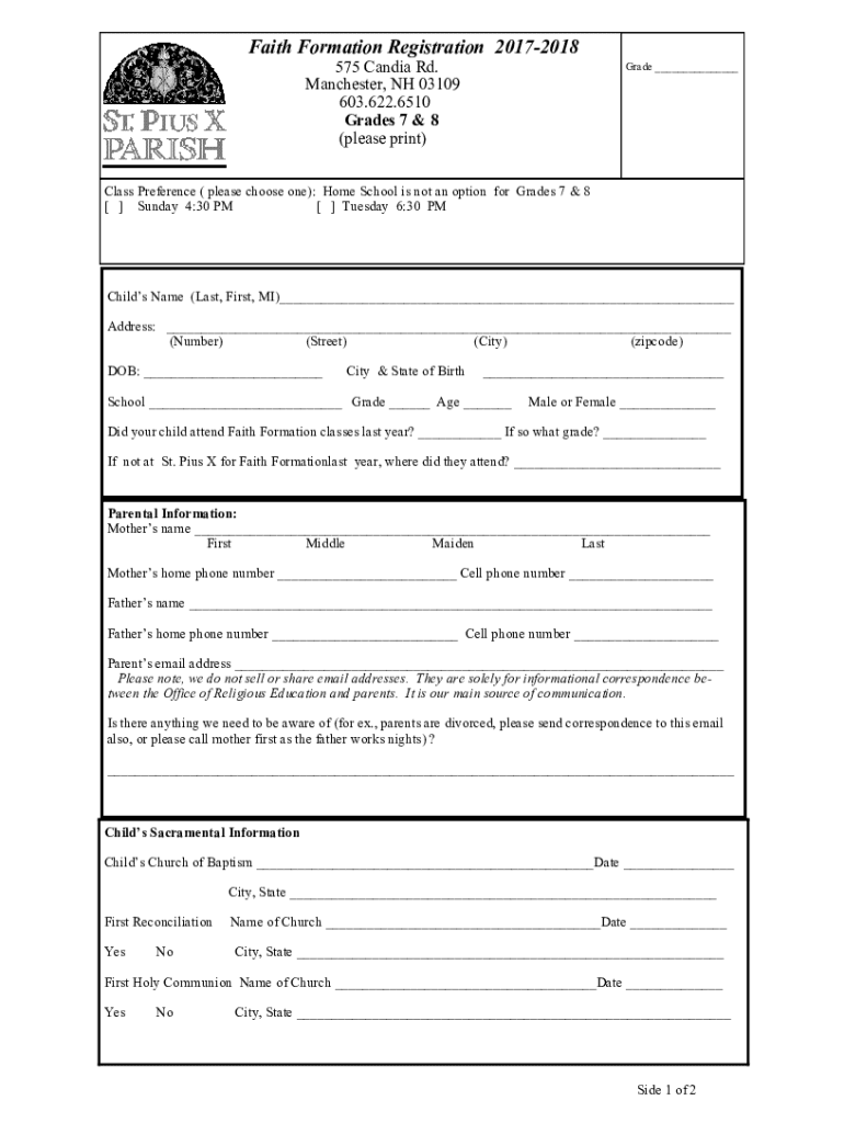 Faith Formation Registration 20172018 575 Candid Rd. Manchester, NH 03109 603.622.6510 Grades 7 & 8 (please print)Grade Class Preference (please choose one): Home School is not an option for Grades