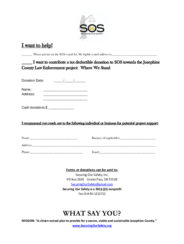 I want to help! Please put me on the SOS email list. My legible email address is: I want to contribute a tax-deductible donation to SOS towards the Josephine County Law Enforcement project: Where