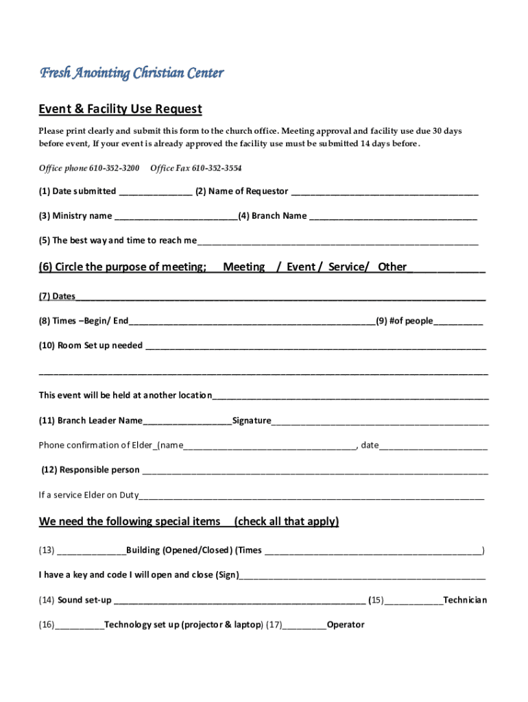 Fresh Anointing Christian Center Event & Facility Use Request Please print clearly and submit this form to the church office. Meeting approval and facility use due 30 days before event, If your event