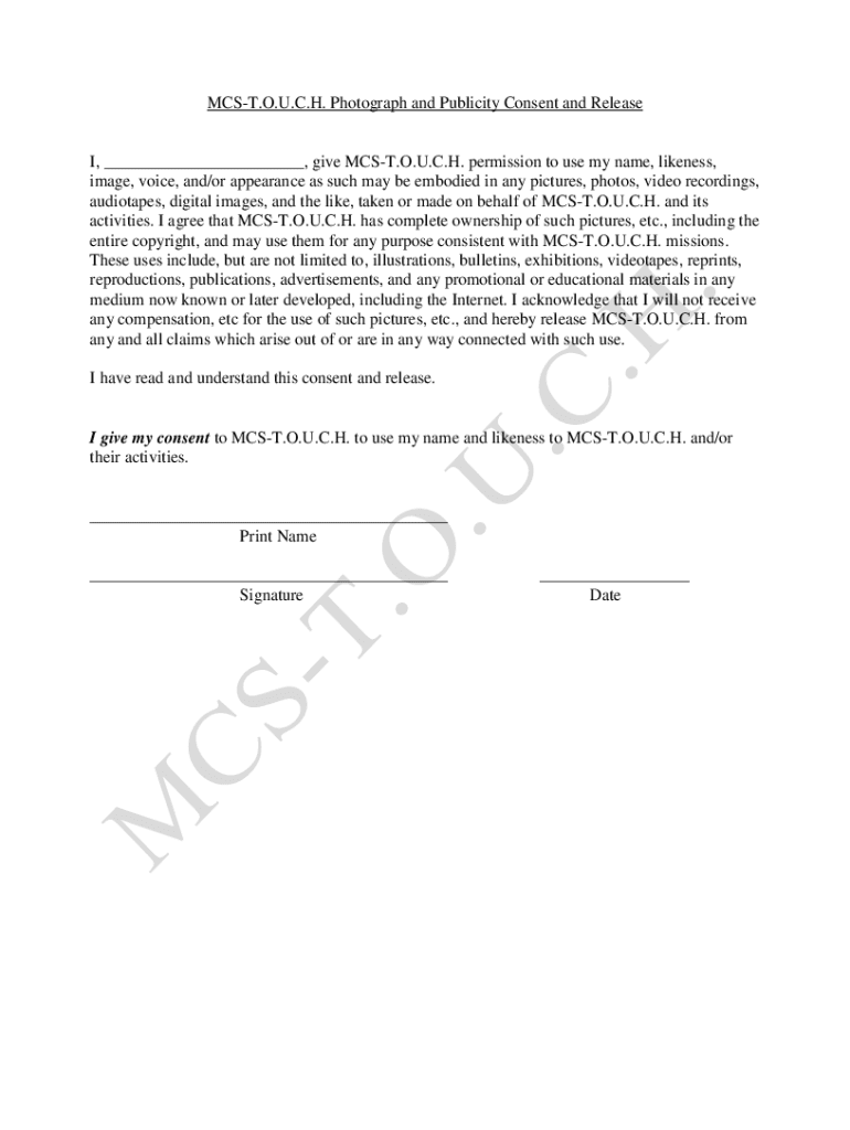 MOST. O.U.C.H. Photograph and Publicity Consent and Released, give MOST. O.U.C.H. permission to use my name, likeness, image, voice, and/or appearance as such may be embodied in any pictures, photos,