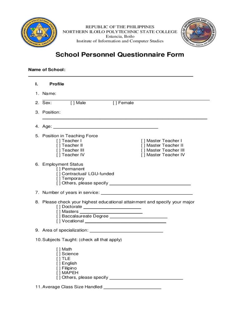 REPUBLIC OF THE PHILIPPINES NORTHERN LILO POLYTECHNIC STATE COLLEGE Estonia, Lilo Institute of Information and Computer StudiesSchool Personnel Questionnaire Form Name of School: I. Profile1. Name: