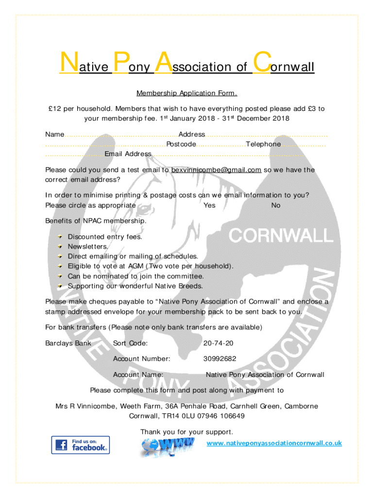 Native Pony Association of Cornwall Membership Application Form. 12 per household. Members that wish to have everything posted please add 3 to your membership fee. 1st January 2018 31st December 2018