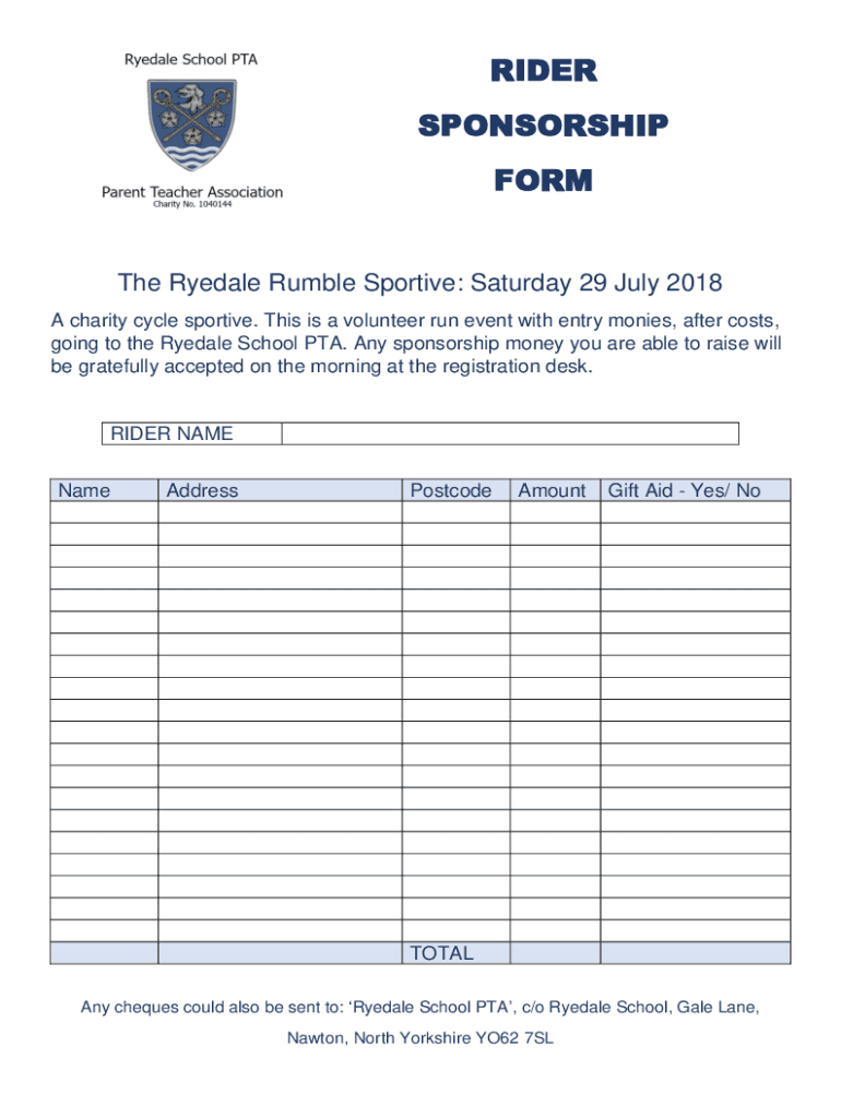 RIDER SPONSORSHIP Forth Rye dale Rumble Sportive: Saturday 29 July 2018 A charity cycle sportive. This is a volunteer run event with entry monies, after costs, going to the Rye dale School PTA. Any