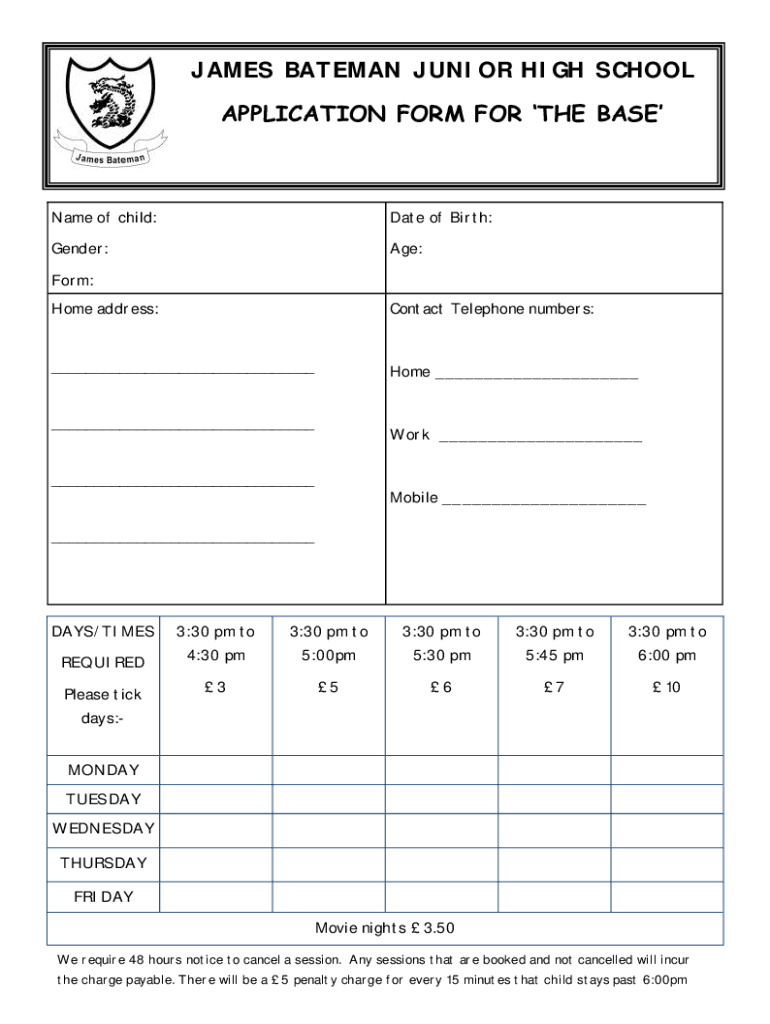 JAMES BATSMAN JUNIOR HIGH SCHOOL APPLICATION FORM FOR THE Basecamp of child:Date of Birth:Gender:Age:Form: Home address:Contact Telephone numbers: Homework Mobile DAYS/TIMES3:30 pm to3:30 pm to3:30