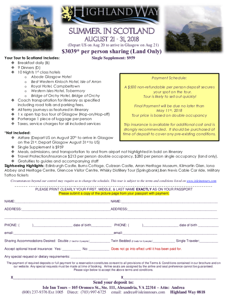 Summer in Scotland August 21 31, 2018(Depart US on Aug 20 to arrive in Glasgow on Aug 21)$3039* per person sharing (Land Only) Your Tour to Scotland Includes: Single Supplement: $959 Breakfast daily