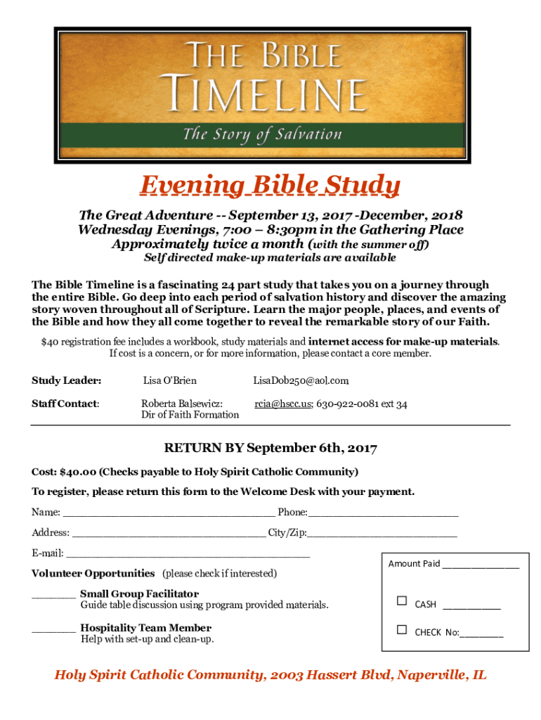 Evening Bible Study The Great Adventure September 13, 2017, December 2018 Wednesday Evenings, 7:00 8:30pm in the Gathering Place Approximately twice a month (with the summer off) Self directed makeup