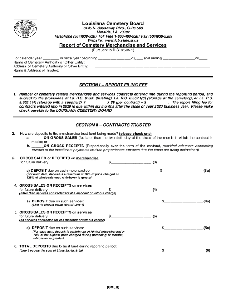 Louisiana Cemetery Board3445 N. Causeway Blvd., Suite 509 Metairie, LA 70002 Telephone (504)8385267 Toll Free 18664885267 Fax (504)8385289 Website: www.lcb.state.la.usReport of Cemetery Merchandise