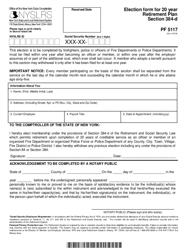 Get the free Election Form for 20 Year Retirement Plan 384-d (PF5517). To opt in to the 20-Year R...