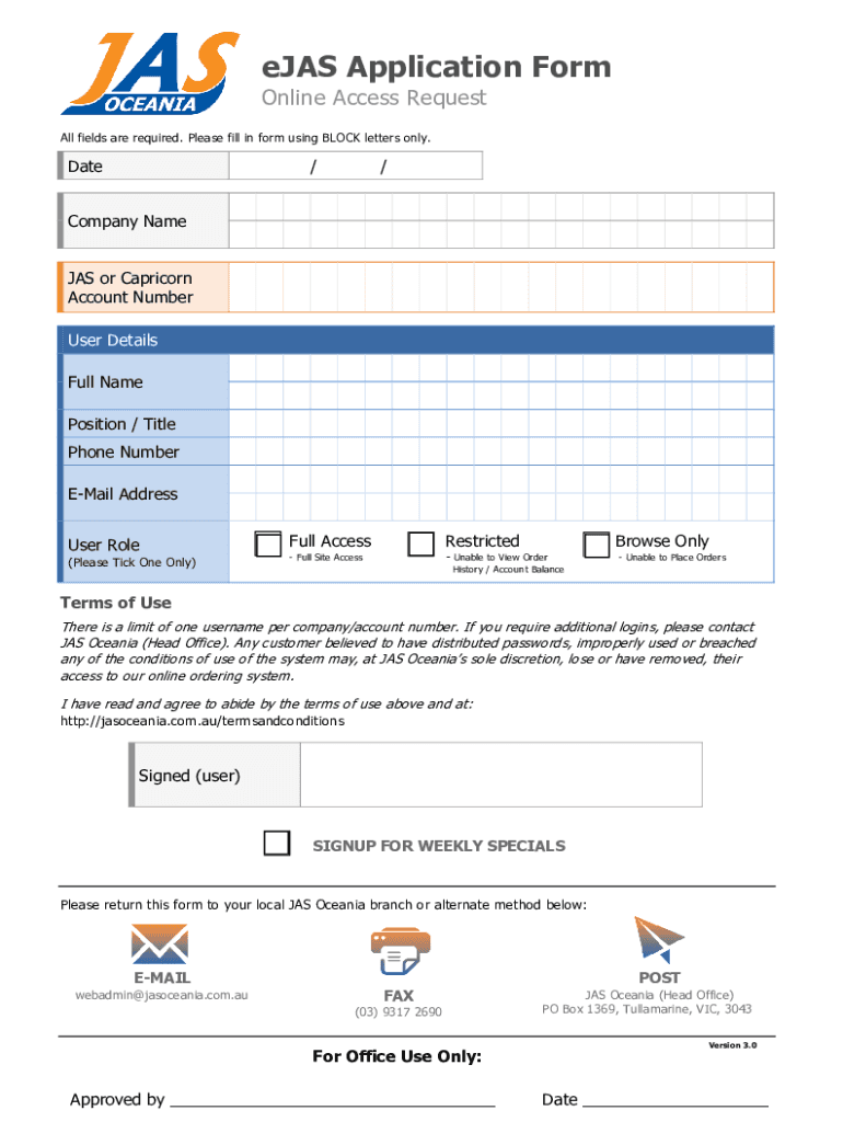 ERAS Application Form Online Access Request All fields are required. Please fill in form using BLOCK letters only. Date//Company Name WAS or Capricorn Account Number User Details Full Name Position