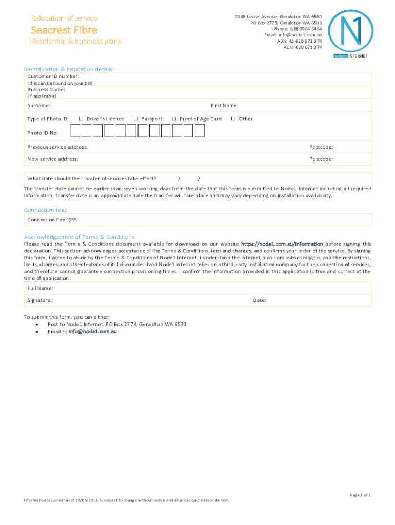 218B Lester Avenue, Geraldton WA 6530 PO Box 2778, Geraldton WA 6531 Phone: (08) 9964 5464 Email: info node1.com.AU ABN: 43 620 671 374 ACN: 620 671 374Relocation of serviceSeacrest Fiber Residential