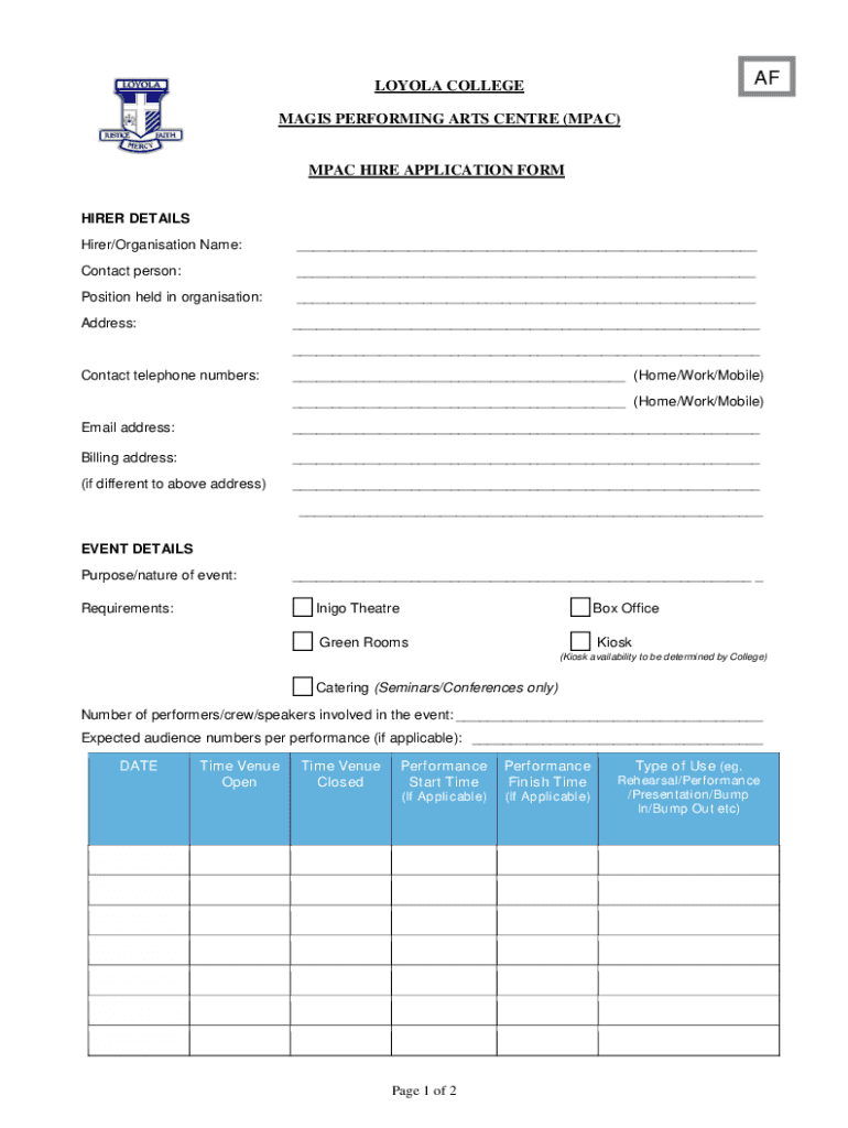 LOYOLA COLLEGE MAGIC PERFORMING ARTS Center (MAC)MAC HIRE APPLICATION FORM HIRED DETAILS Hired/Organization Name: Contact person: Position held in organization: Address: Contact telephone numbers: