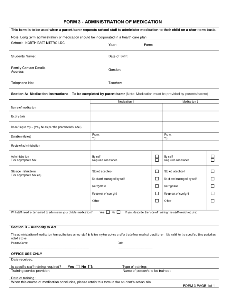 FORM 3 ADMINISTRATION OF MEDICATION This form is to be used when a parent/carer requests school staff to administer medication to their child on a short term basis. Note: Long term administration