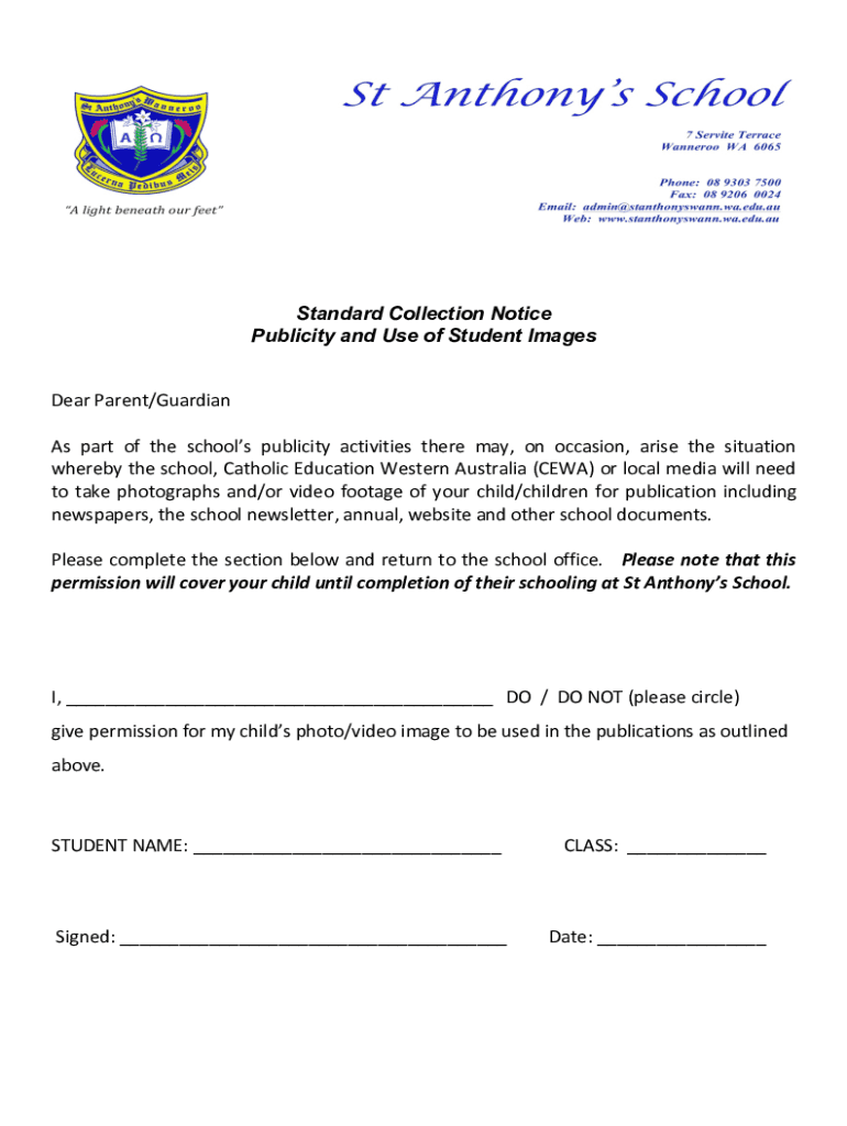 Dear Parent/GuardianAspartoftheschoolspublicityactivitiestheremay, on occasion, arisethesituationwhereby the school, Catholic Education Western Australia (CEA) or local media will needtotakephotographsand/orvideofootageofyourchild/childrenforpublicationincludingnewspapers, the school newsletter, annual, website and other school documents.