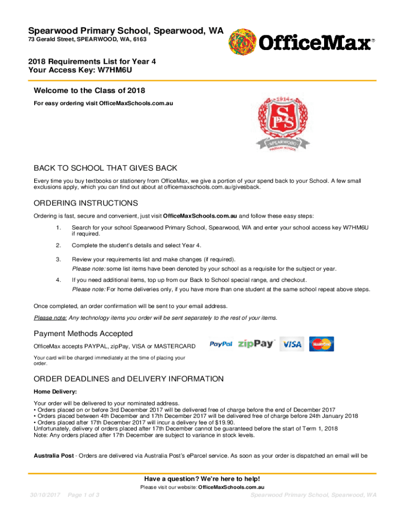 73 Gerald Street, SHERWOOD, WA, 61632018 Requirements List for Year 4