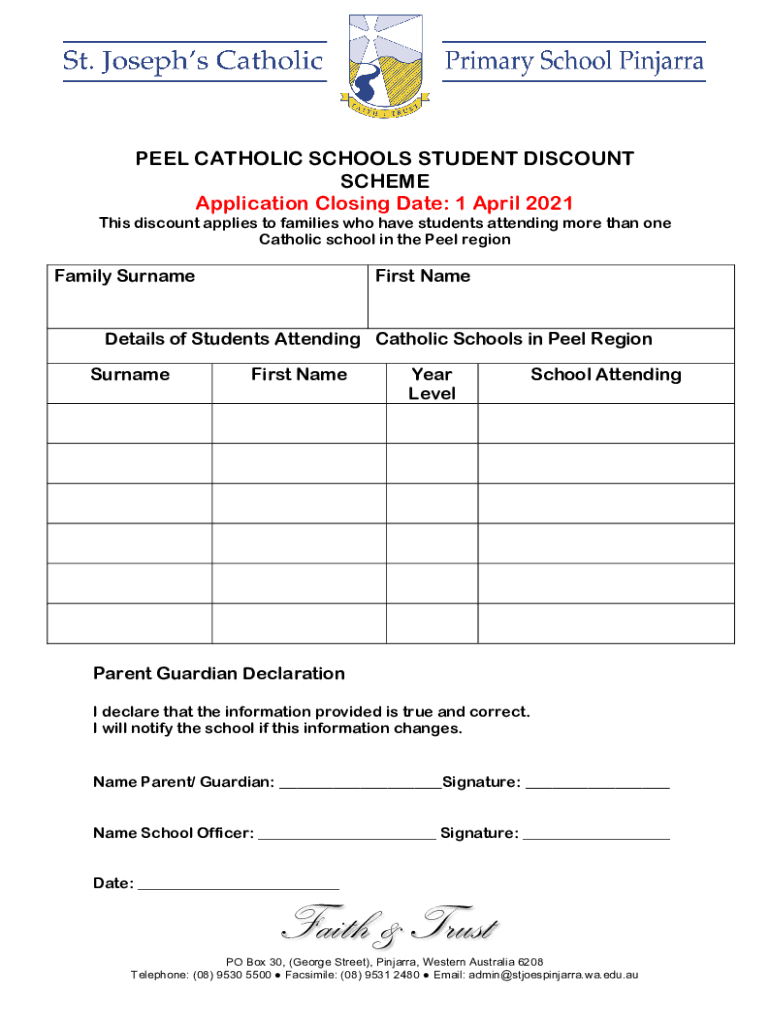 Get the free PEEL CATHOLIC SCHOOLS STUDENT DISCOUNT SCHEME Application ... - stjoespinjarra wa edu