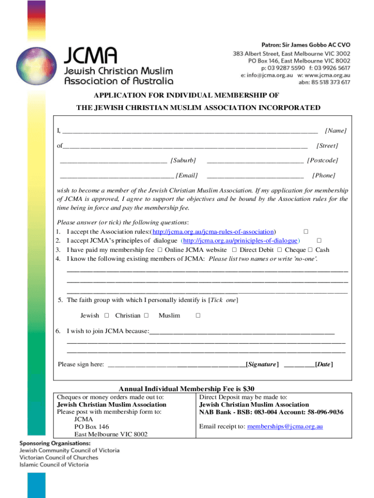 APPLICATION FOR INDIVIDUAL MEMBERSHIP OF THE JEWISH CHRISTIAN MUSLIM ASSOCIATION INCORPORATED I, Name of Street Suburb Postcode Email Phone wish to become a member of the Jewish Christian Muslim Association.