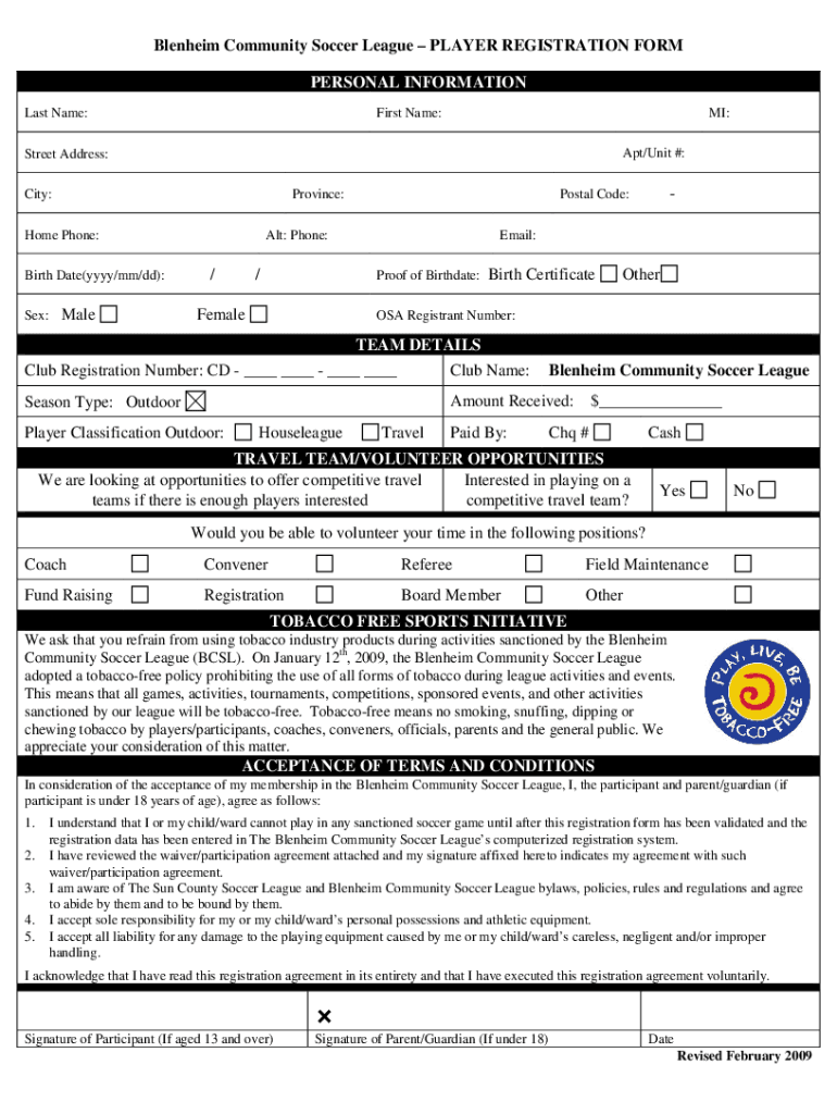 Blenheim Community Soccer League PLAYER REGISTRATION FORM PERSONAL INFORMATION Last Name:First Name:MI: Apt/Unit #:Street Address: City: Home Phone: Birth Date(YYY/mm/dd): Sex:Malala: Phone://Email: